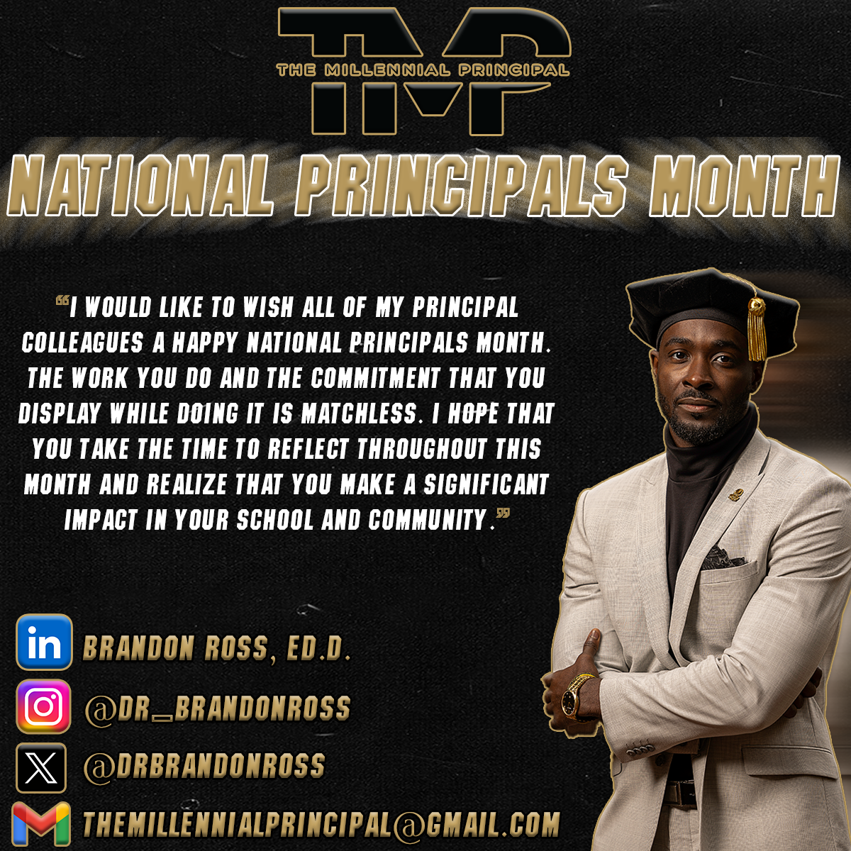 Principals, I hope you take the opportunity to reflect throughout this month on the significant impact you make within your school and community. I encourage you to continue to operate with courage, a spirit of steadfastness, and a heart for people. While the work is at times, exhausting and overwhelming, I hope the moments that bring you joy are priceless and remind you of why you answered the call to lead students, staff, and families. Thank you!